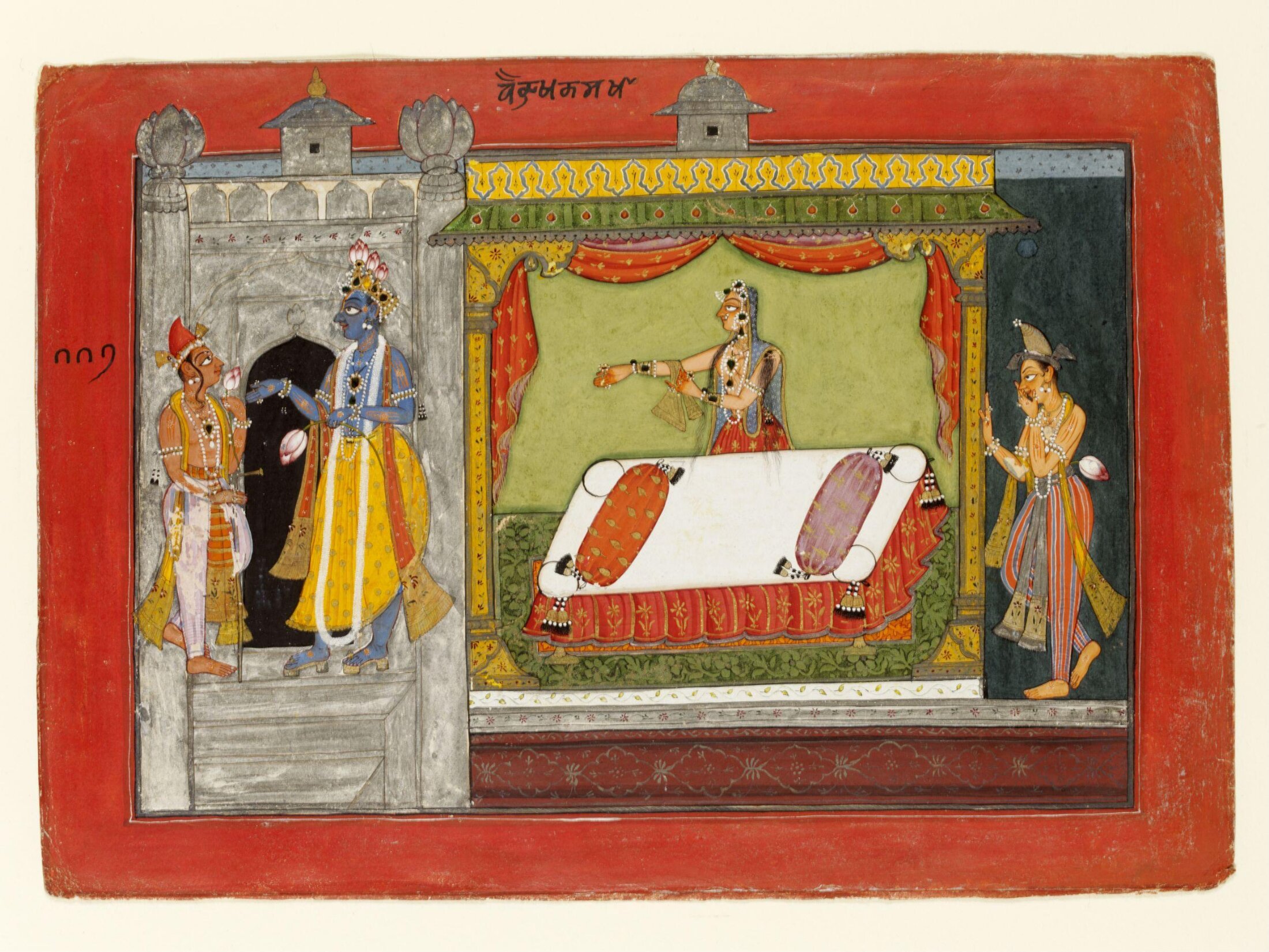 On verso in Sanskrit: "Having coaxed my lotus-faced girl to come near the couch, I eagerly prepared to loosen her bodice. Meanwhile, the clown, my friend, repeatedly crowed like a young rooster as if heralding the dawn."